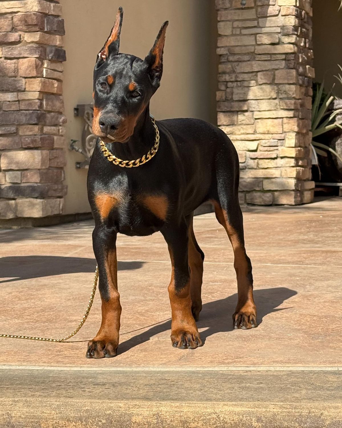 Doberman – A large, muscular, and intelligent breed from Germany, originally bred for guarding and protection. They are loyal, alert, and highly trainable, making them excellent family guardians and working dogs. Dobermans have a short, sleek coat in black, red, blue, or fawn with rust markings. They need daily exercise, mental stimulation, and consistent training.
